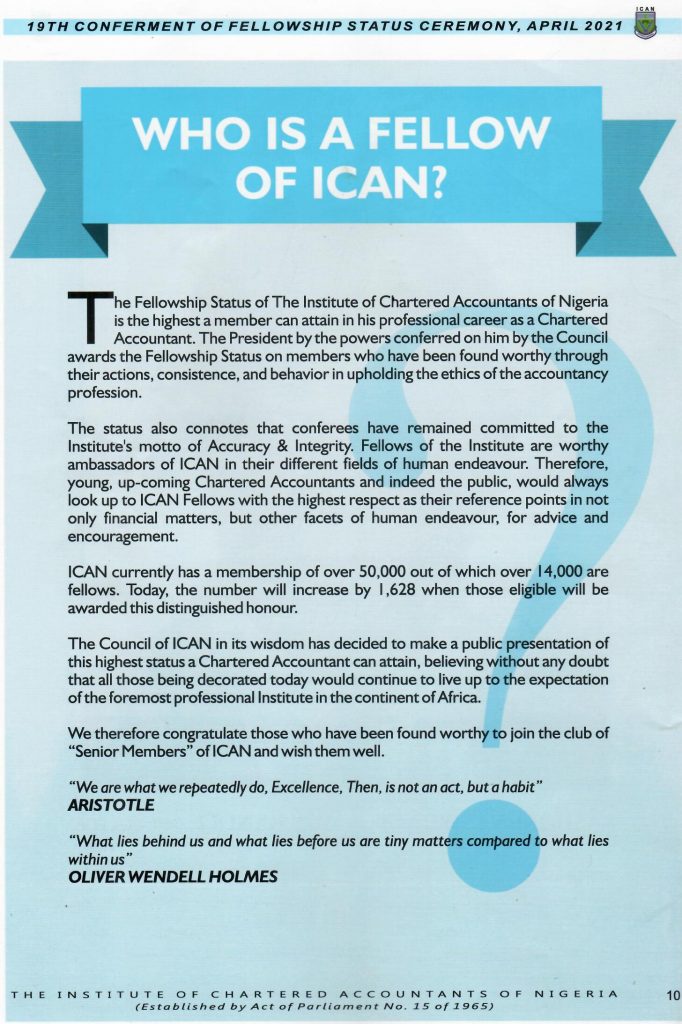 The fellowship status (FCA) of ICAN is an enviable status that could only be awarded to a well rounded professional individuals who have: